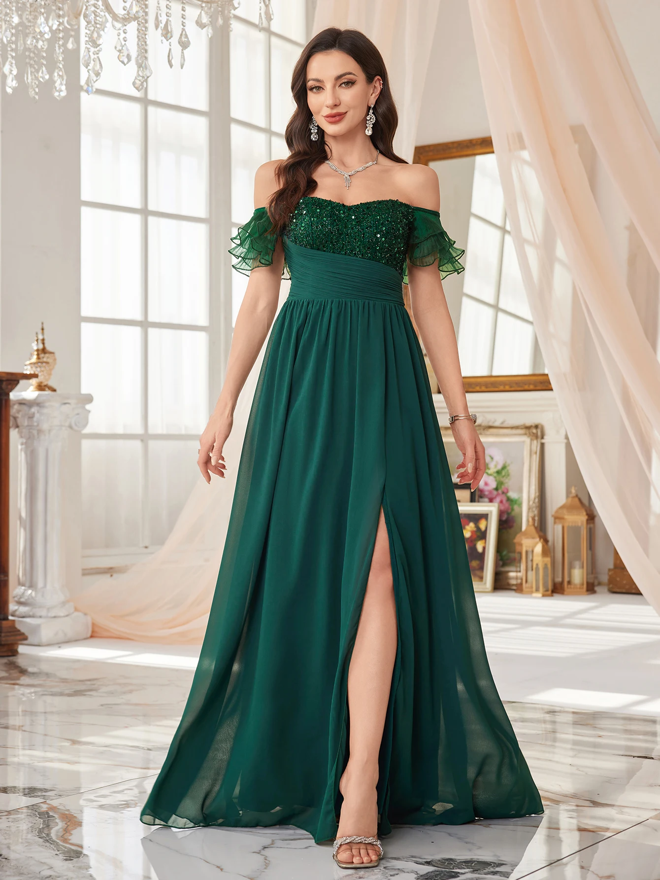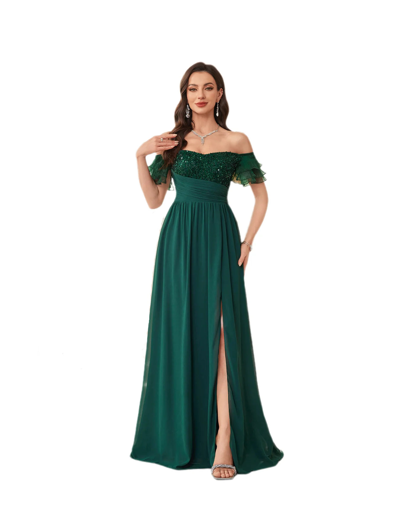 Green Color Off Shoulder Sequin Pearl Ruffle 3-Layer Sleeve Waistband Gathered Side Slit Chiffon Formal Evening Dress for Women